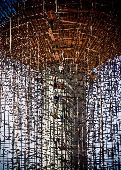 Scaffolding today is mainly made of metal pipes. But in some parts of Asia, scaffolding is made of bamboo and is even used when building very tall skyscrapers.